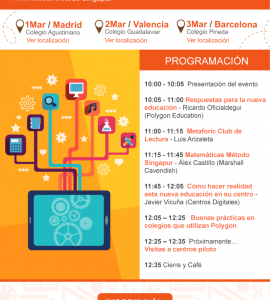 El día 1 de marzo estaremos en Madrid en el colegio Agustiniano, al día siguiente nos podrás encontrar en Valencia, en Guadalaviar, y el 3 de marzo en Barcelona, en el colegio Pineda. En la jornada podrás conocer de la mano de nuestro directorr, Ricardo Oficialdegui, qué es Polygon Education. En qué consiste nuestro sistema de enseñanza/aprendizaje. Generamos contenidos bajo el Marco de Enseñanza para la Comprensión de Harvard, nuestros alumnos trabajan por proyectos, con rutinas y destrezas de pensamientos, inteligencias múltiples…