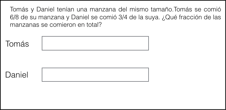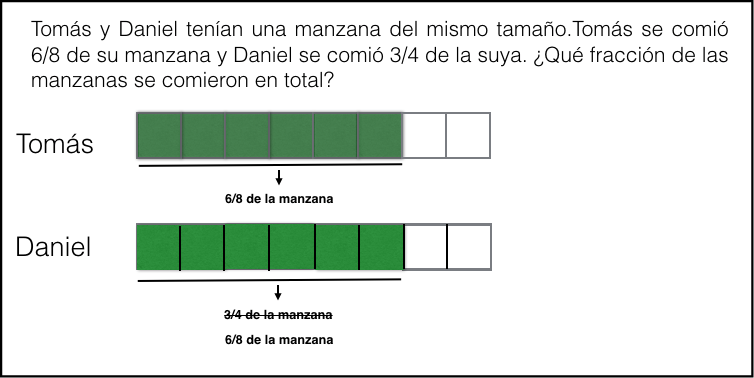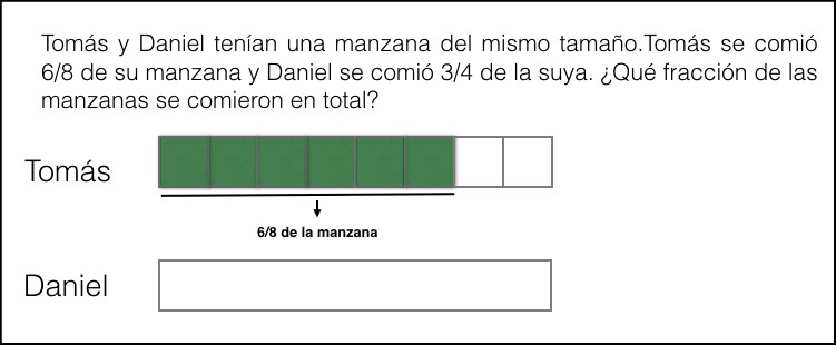 Con esta información, ¿podemos responder la pregunta? Todavía no, porque la pregunta es qué fracción de las manzanas se comieron en total ambos. Y el problema es que Tomás tiene una manzana dividida en 8 y Daniel otra dividida en 4.
