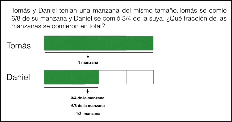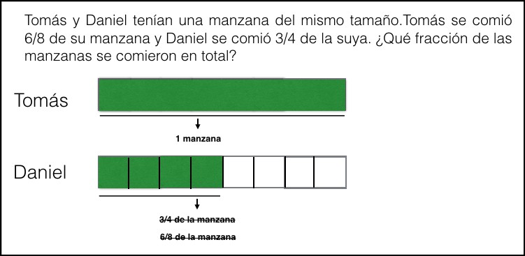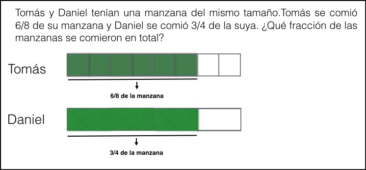 Si respondiéramos que se comieron en total 9 partes las dos manzanas no sería una respuesta precisa, porque entonces podríamos decir, por ejemplo, que si Tomás se comió 9 y Daniel 3, entonces Tomás comió más que Daniel, lo cual no es correcto.