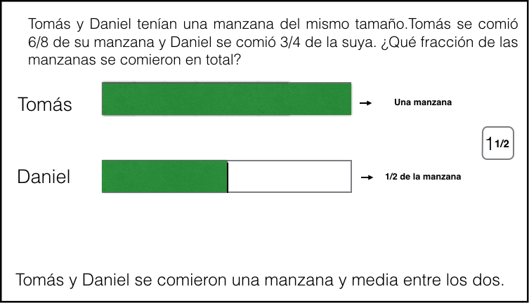 7. A Daniel le queda ahora media manzana y por tanto podemos concluir que Tomás y Daniel se comieron entre los dos 1 manzana y media. Es importante que el niño vea que no es que Tomás se comió una manzana y Daniel media, sino que entre los dos se comieron una manzana y media. Lo representarlo visualmente de este otro modo.